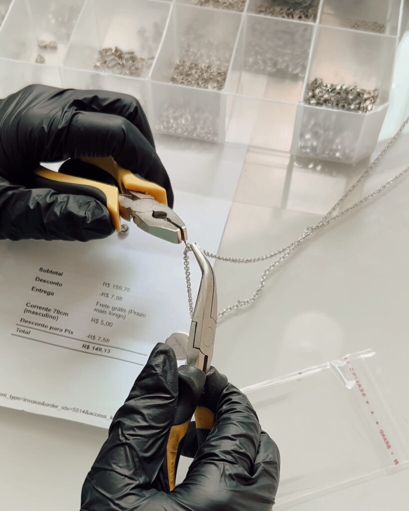 A maior parte dos nossos acessórios é produzida por nós, de forma artesanal, principalmente os personalizados. Cada peça é feita com cuidado, utilizando aço inoxidável, material que não escurece, não enferruja e acompanha você por muito tempo.