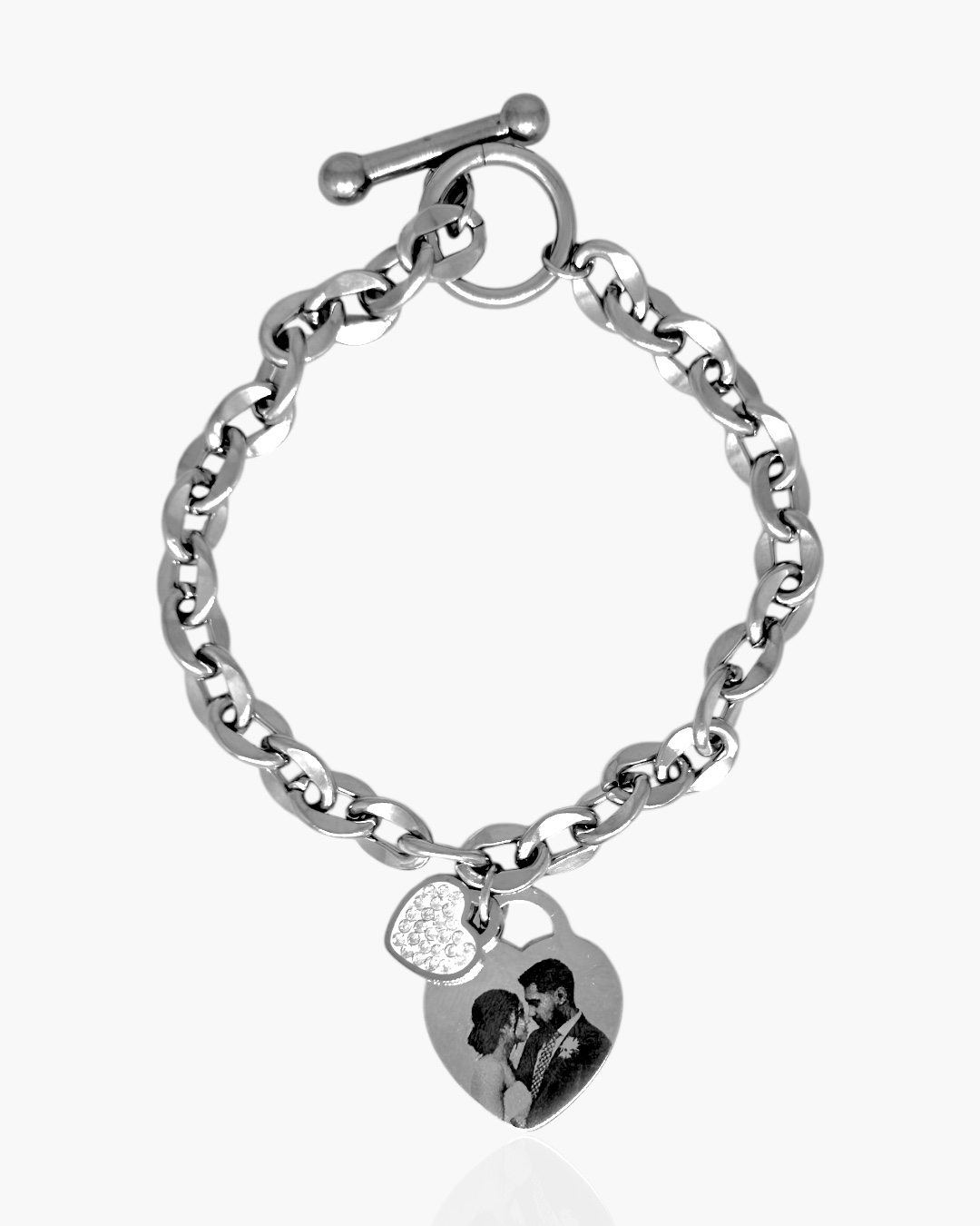 Pulseira Coração Personalizada com foto em aço inoxidável. Peça exclusiva gravada a laser.