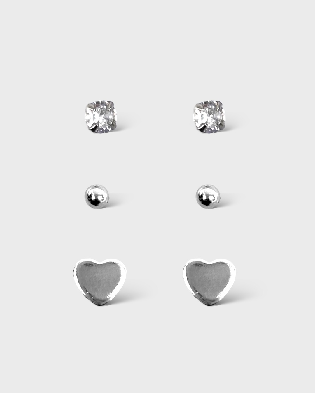 Trio Brincos Zircônia Bolinha e Coração em Aço Inoxidável